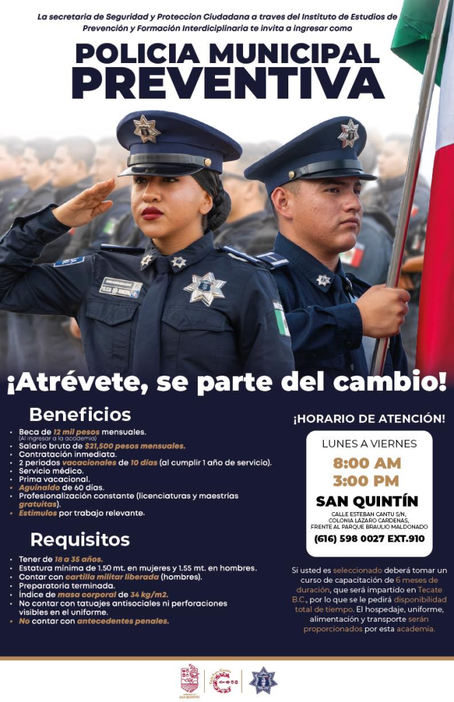 San Quintín.- La Dirección de Seguridad y Protección Ciudadana de San Quintín informó que la Secretaría de Seguridad y Protección Ciudadana, a través del Instituto de Estudios de Prevención y Formación Interdisciplinaria, mantiene abierta la convocatoria para integrar nuevos elementos a la Policía Municipal Preventiva.