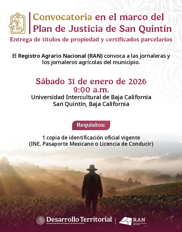 San Quintín.- En el marco del Plan de Justicia para San Quintín, el Registro Agrario Nacional (RAN) lanzó una convocatoria dirigida a las y los