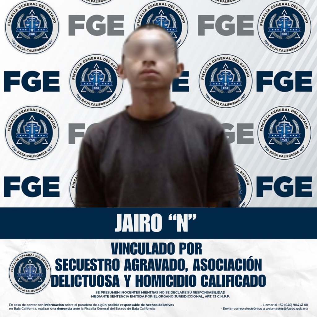 SAN QUINTÍN, BAJA CALIFORNIA, A 16 DE FEBRERO DE 2026.- La Fiscalía General del Estado informa que Jairo “N” fue vinculado a proceso por los delitos de secuestro agravado, asociación delictuosa y homicidio calificado, en relación con el homicidio de un joven ocurrido la noche del 24 de agosto de 2025, en el municipio de San Quintín. Con esta acción, suman cinco personas detenidas dentro de este caso.