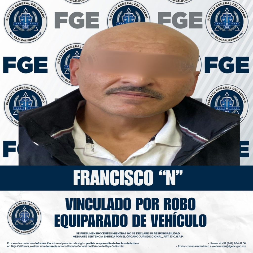 ENSENADA, BAJA CALIFORNIA, A 6 DE SEPTIEMBRE DE 2025.- La Fiscalía Regional de Ensenada, en coordinación con la Unidad de Robo de Vehículos, logró la vinculación de Francisco “N”, acusado por el delito de robo equiparado de vehículo de motor, en su modalidad de uso.